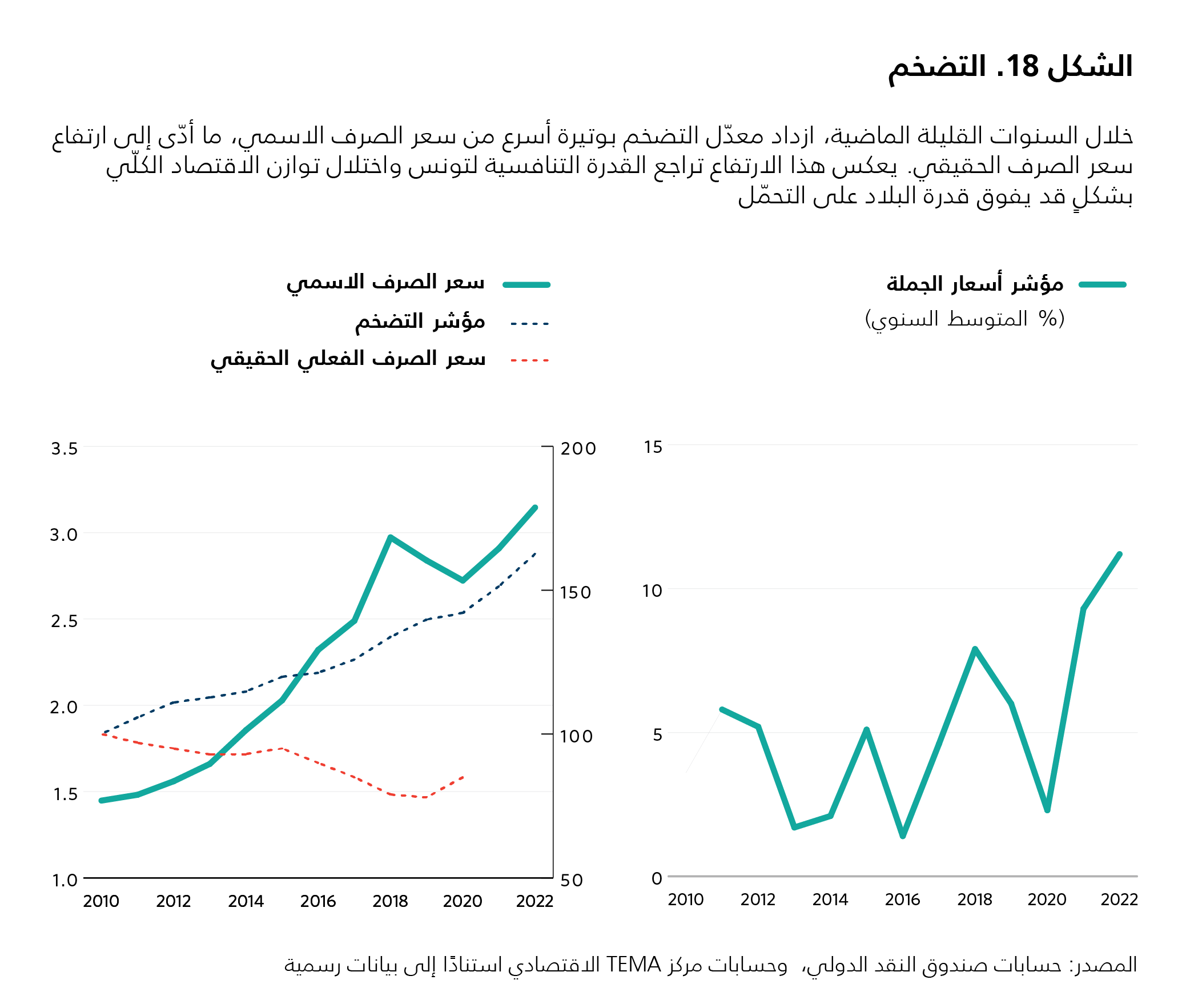 تاريخيًا، أعطت تونس الأولوية لضبط التضخم. ولكن معدّل التضخم ارتفع إلى ما يناهز 9 إلى 10 في المئة في العام 2023، بدفعٍ من الارتفاع في أسعار المواد الغذائية التي ازدادت بنسبة 15.3 في المئة في الربعَين الأولين من العام 2023. ولكن في الربع الثالث من العام، لم يحدث تضخم، نظرًا إلى أن قيمة الدينار لم تتراجع مقابل العملات الأجنبية الأساسية. وفضلًا عن ذلك، انخفضت الأسعار العالمية للموادّ الغذائية الأساسية المستوردة. وهكذا، يعبّر ارتفاع الأسعار في تونس بوضوح عن شحّ المواد الغذائية محليًا وعن تأثير الكتلة النقدية التي ولّدها المصرف المركزي من خلال التمويل غير المباشر للعجز.