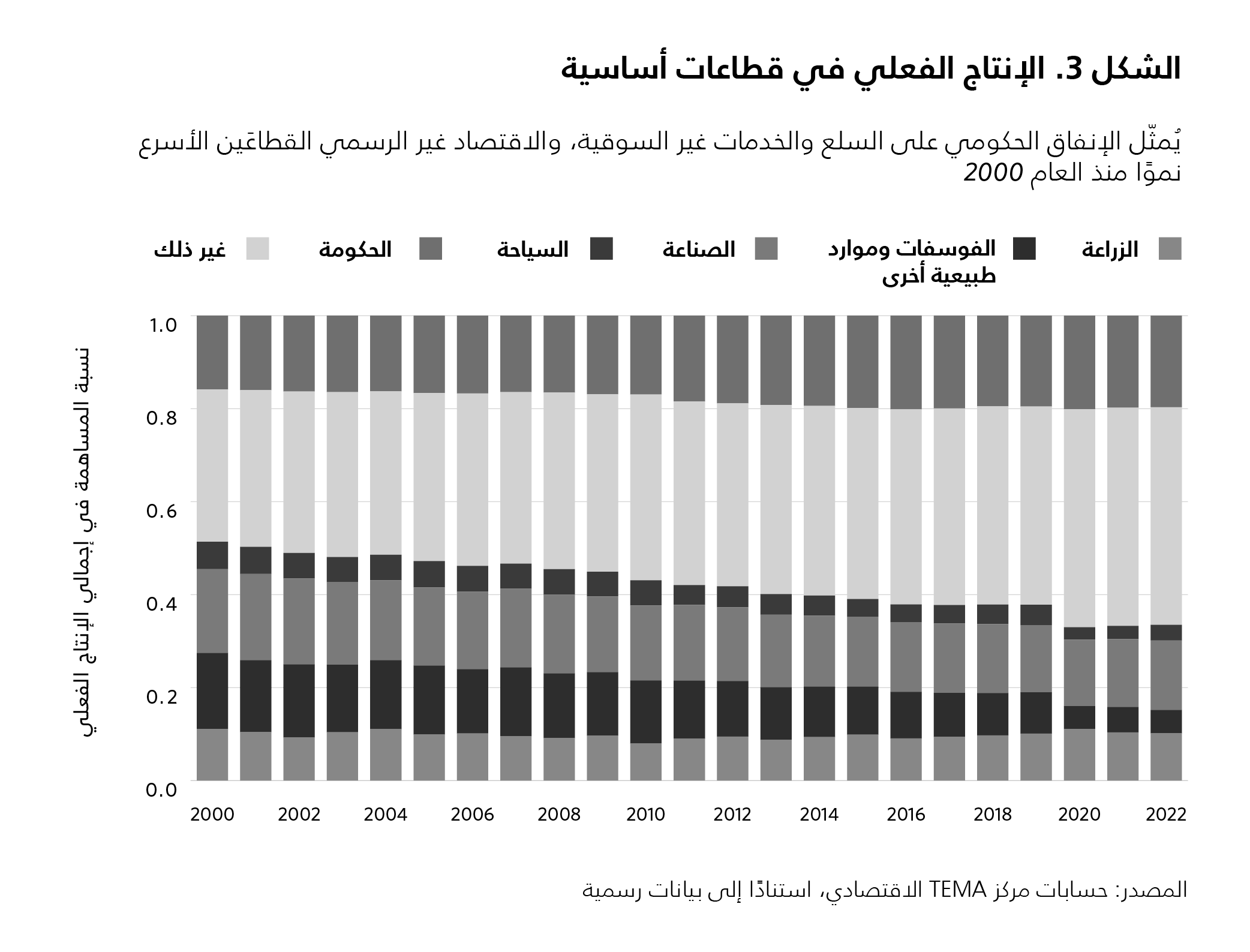 الواقع أن الأداء الضعيف الذي سجّله الاقتصاد التونسي في العام 2023 ليس سوى امتدادٍ لمسارٍ يسلكه منذ عقدٍ من الزمن ويتّصف بضعف العوامل التي تسهم في بناء الحركة الاقتصادية. فقد اقتصر النمو المُحقَّق على كلٍّ من القطاع العام والاقتصاد غير الرسمي، فيما شهدت الأقسام الدينامية من الاقتصاد انكماشًا (انظر الشكل 3). وساهمت الأزمات المتتالية وانعدام الاستقرار السياسي في تقويض القطاع السياحي، بينما تضرّرت قطاعات اقتصادية عدّة بسبب توقّف التوسّع التصنيعي وانهيار إنتاج الفوسفات.