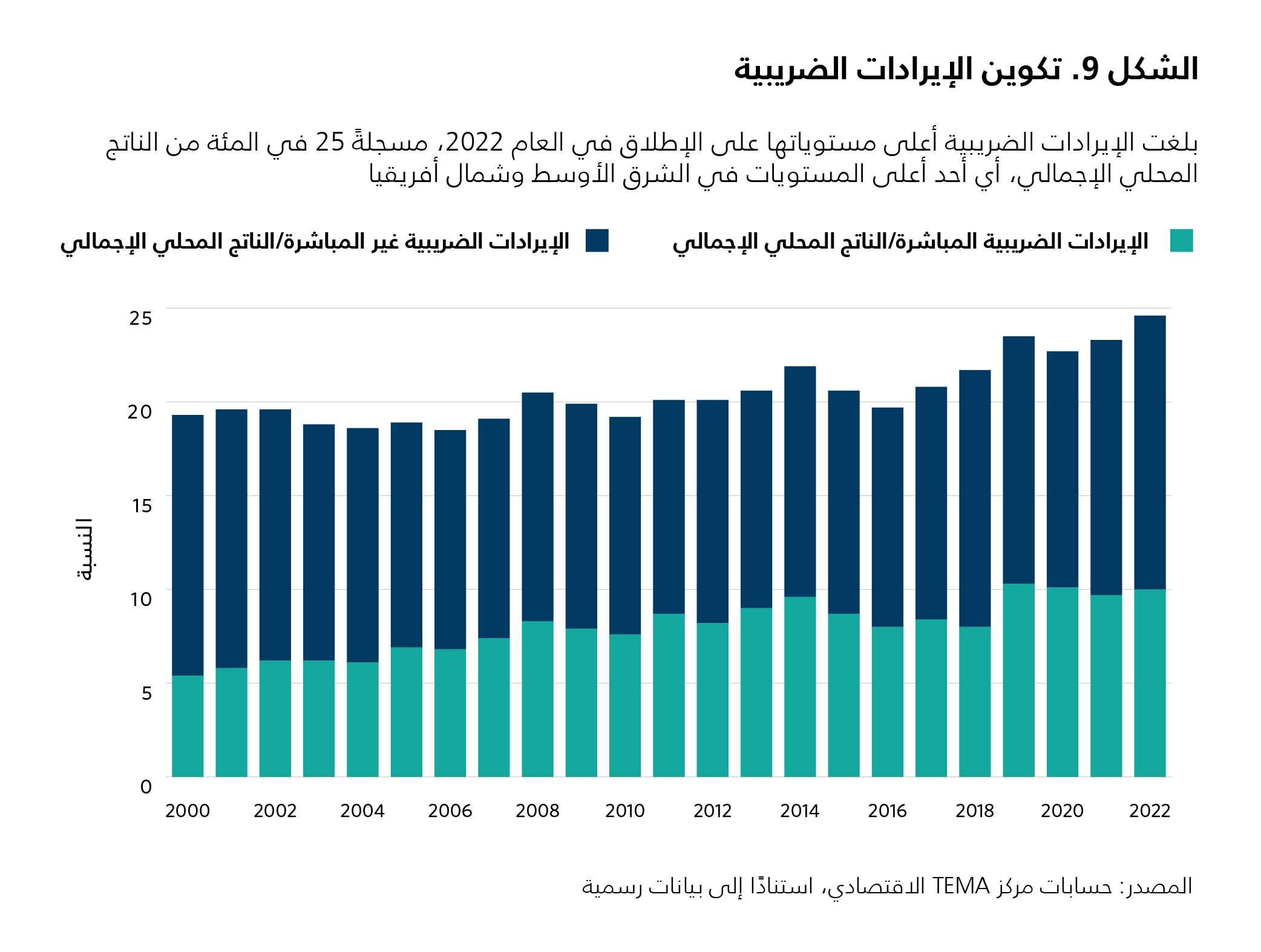 تُعدّ الإيرادات الضريبية مرتفعة مقارنةً مع المعايير الدولية، إذ سجّلت 25 في المئة من الناتج المحلي الإجمالي في العام 2023 (انظر الشكل 9). وعلى الرغم من أن المجال المتاح أمام زيادة الإيرادات محدود، قُدِّمَت اقتراحات لجعل الضرائب تصاعدية أكثر. ومنذ الإصلاح المالي في العام 2016، تمّ تحديد الحدّ الأقصى للضريبة المفروضة على ذوي الدخل المرتفع عند 35 في المئة. هذا وتشكّل الضرائب غير المباشرة، التي تؤثّر في المقام الأول على الطبقة الوسطى، أكثر من نصف الموارد الضريبية. علاوةً على ذلك، من شأن إجراءاتٍ مثل إصلاح نظام الضريبة على القيمة المضافة من خلال التخلّص من الثغرات، ورفع الضريبة على السلع الفاخرة، وخفضها على السلع الأساسية، أن تحسّن توزيع العبء الضريبي. لقد أقرّ قانون المالية لسنة 2023 ضريبة جديدة على الثروة العقارية، لكن من المستبعد أن تُحصِّل مبالغ كبيرة على المدى القصير.