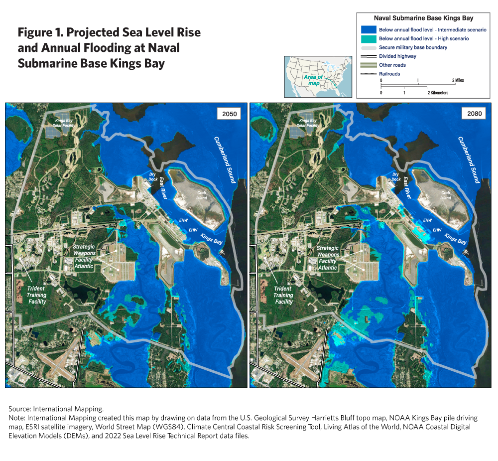 Naval Submarine Base Kings Bay is vulnerable to rising sea levels and flooding that could significantly affect its capacity to service U.S. ballistic missile submarines (SSBNs). Because Kings Bay is one of two bases equipped to support the U.S. SSBN fleet, climate change effects there could have serious repercussions for the broader deterrence mission of the submarine leg of the nuclear triad.