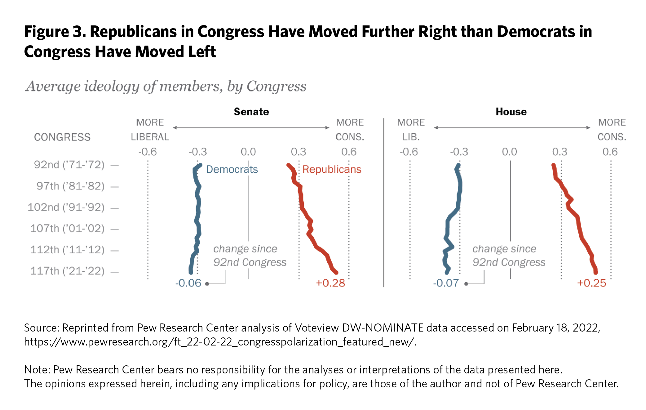 Political scientists began to look into the issue and brought with them the tools of their discipline, which conceived of polarization as ideological distance between policy preferences. To measure that ideological distance in Congress, they used a dataset called DW-Nominate that looked at how members voted.55 Three seminal studies published between 2006 and 2015, including a task force convened by the American Political Science Association, summarized scholarly opinion.56 They found that:
