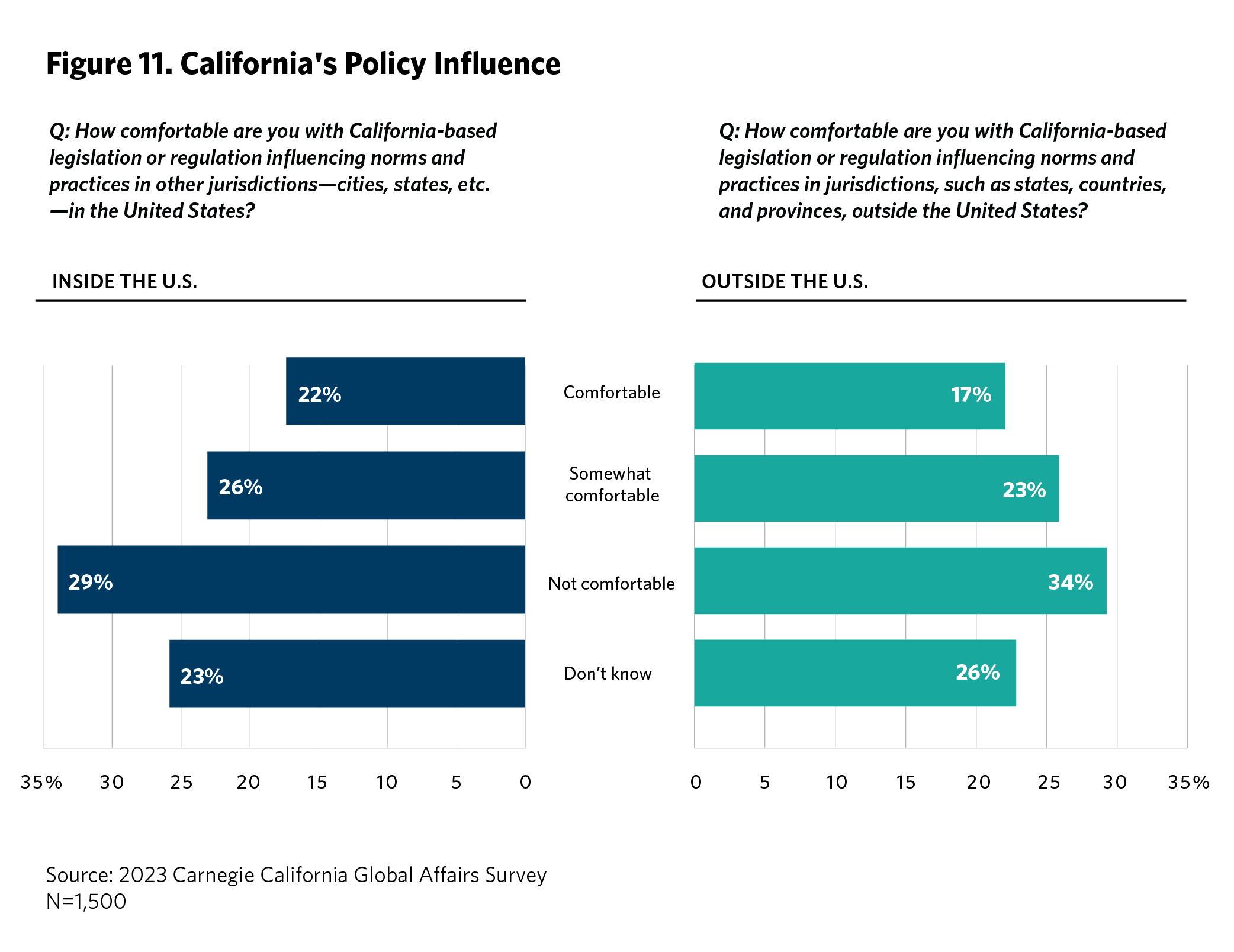 Increasingly, policy development, and particularly regulation, has influence on jurisdictions across national borders. This is particularly true when the regulatory jurisdiction—like, for example, the European Union—is large, has regulatory capacity, and targets inelastic markets or sectors.21 Californians are somewhat less comfortable with transnational influence, with only 40 percent of those surveyed being comfortable or somewhat comfortable with California-based legislation or regulation influencing norms and practices in jurisdictions, such as states, countries, and provinces, outside the United States. In addition to the partisan divide, there is a notable urban-rural divide around such influence, with more than one in two big-city residents expressing some comfort, while 54 percent of rural residents are not comfortable.